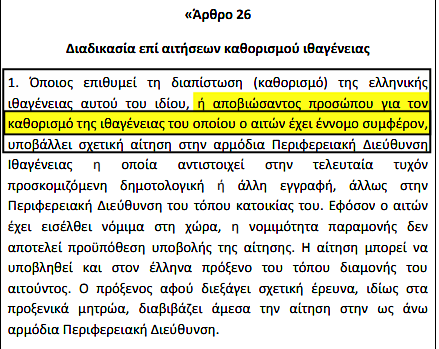 Μετά από αυτό γίνεται γνωστό ότι στις διατάξεις του Κώδικα Ιθαγένειας που πέρασαν προ ημερών σε πολυνομοσχέδιο, δίνουν με το άρθρο 26 το δικαίωμα στην αίτηση για να λάβει Ιθαγένεια εκ των υστέρων το αποβιώσαν πρόσωπο και ο συγγενής που θα την υποβάλλει.
