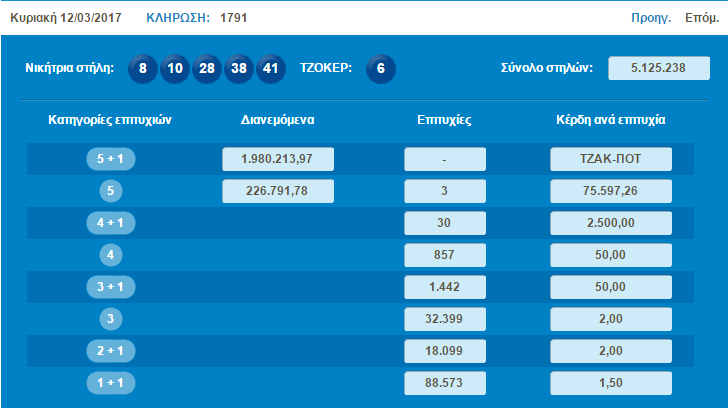 € 2.500.000 τουλάχιστον θα μοιραστούν οι τυχεροί της 1ης κατηγορίας στην επόμενη κλήρωση της ΠΕΜΠΤΗΣ 16/03/2017 μετά το ΤΖΑΚ-ΠΟΤ που σημειώθηκε κατά τη σημερινή διαλογή της 1791ης κλήρωσης του ΤΖΟΚΕΡ.